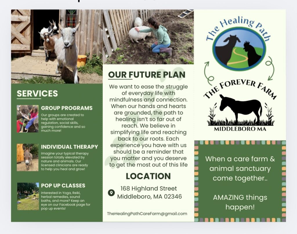 The Healing Path Care Farm is located in Whitman, Massachusetts, and provides innovative psychotherapy that incorporates interaction with animals. October marked a milestone moment for The Healing Path. Five and a half years after purchasing their original farm in Whitman, the care farm is proudly opening its second location at The Forever Farm in Middleboro.