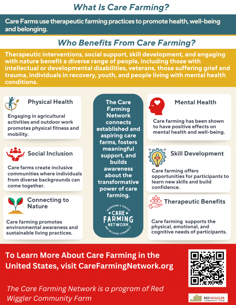 - Mental Health: Care farming has been shown to have positive effects on mental health and well-being. Spending time in nature and participating in therapeutic activities can reduce stress, anxiety, and depression. The sense of accomplishment from completing farm tasks and the social interaction with others also contribute to improved mood and self-esteem.