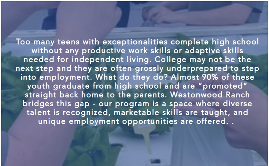 Westonwood Ranch will offers an unique learning curriculum to improve life skills and pre-vocational skills to young adults with developmental differences. Program participants will have the opportunity to engage in a vast variety of skill sets and activities. Similar to a “college model”, the participants will have direct input into their unique learning curriculum by selecting from and participating in an array of diverse classes. The goal of our programs is to increase independence, gain self-confidence, obtain gainful employment in the community and successfully transition into adulthood.