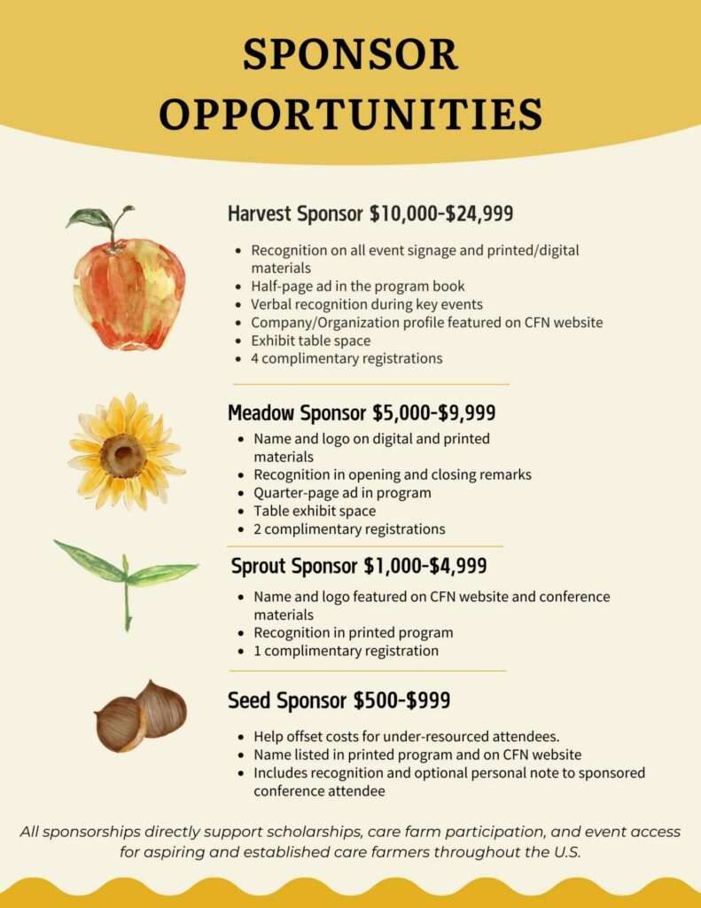 We offer various sponsorship levels designed to meet your specific needs and interests, each providing unique opportunities for recognition and visibility in print and digital promotional materials in the months leading up to the conference and throughout our event. Becoming a sponsor of the Care Farming Network National Conference is more than just brand exposure—it’s an opportunity to align your organization with a growing, values-driven movement and directly fuels scholarships, accessible programming, and the continued growth of a transformational movement.