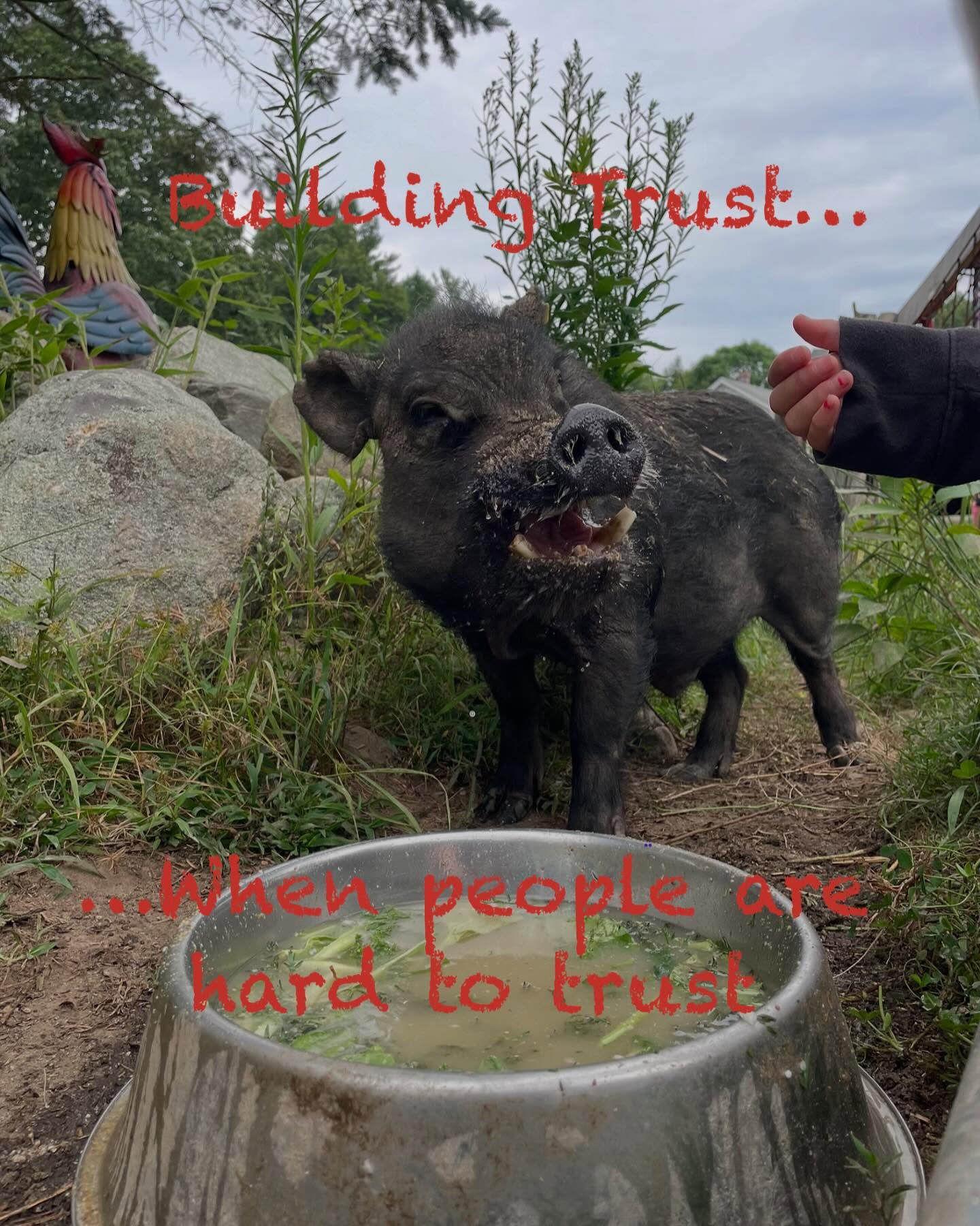 when he first came to Leila’s farm. He was shy and would back away, isolating, and running from everyone (even his little brother). But slowly—through people giving him time, patience, and wells of compassionate understanding —Tiny began to learn that proximity, affection and care didn’t have to mean danger. One small moment at a time, he discovered safety in connection. Now, he’s able to face his biggest fear and has reached a level of safety (with his selected trusted few) to roll on his tummy and accept pets.