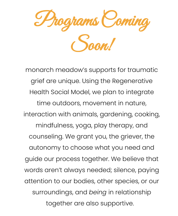 Our VISION is that all animals and humans living with the effects of bereavement and suffering have a haven in which to breathe, mourn, and receive nourishment in unhurried, gentle ways through connection with the land, self, and others.