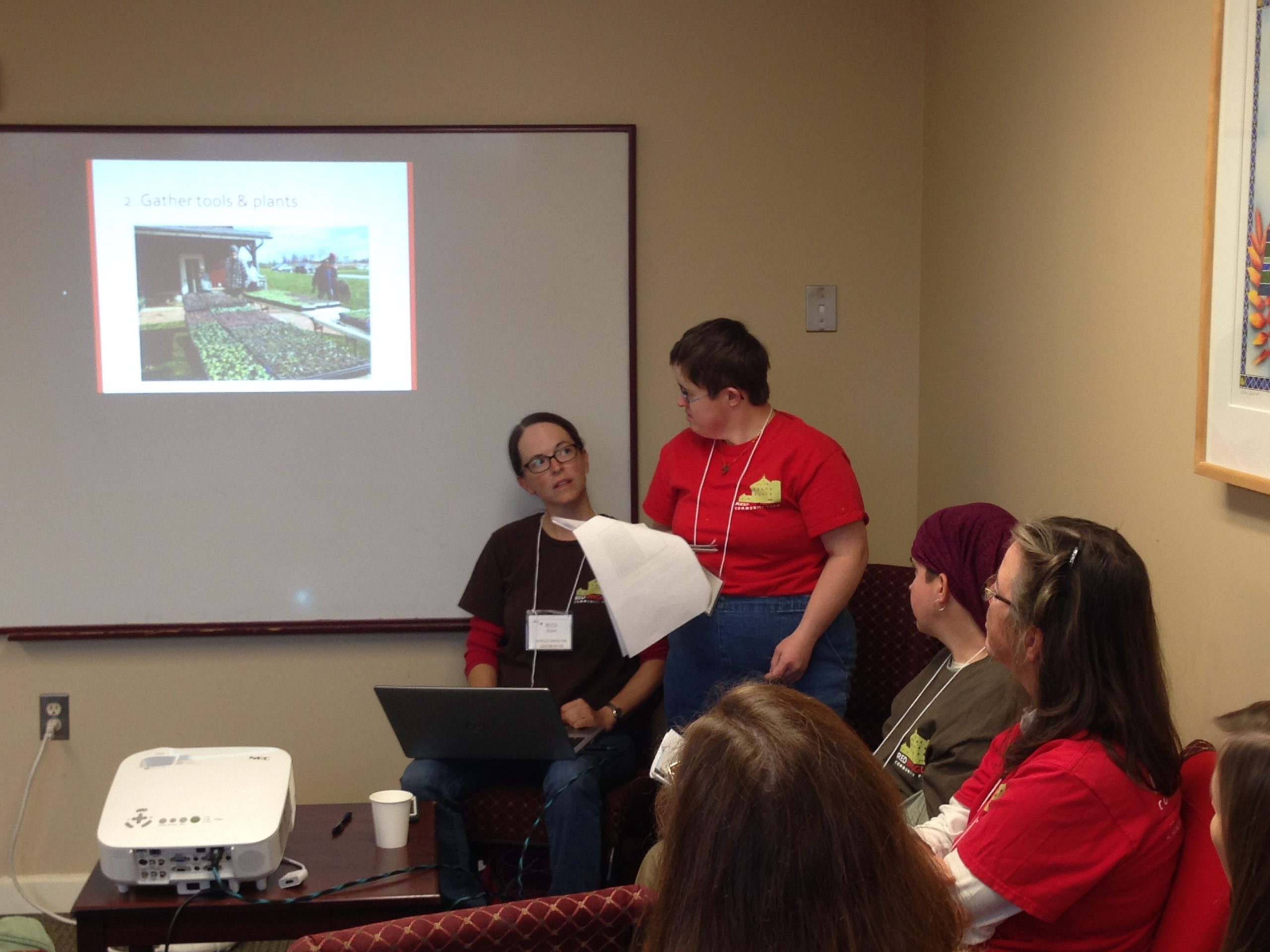 In the second presentation, Melissa discussed the nuts and bolts of managing daily farm tasks within an inclusive environment of employees and volunteers. She discussed strategies to utilize each person’s strengths to complete farm tasks and how to match up individuals with and without disabilities to make the best farm teams. Sam shared how she has grown as a leader at the wash station, Elaine presented the multi-step process for planting kale, and Katie talked about best practices for managing a large group of 20 volunteers. Afterwards, a workshop attendee, who has a child with Down syndrome, commented how thrilled she was to see Red Wiggler’s employees with developmental disabilities included in presenting.